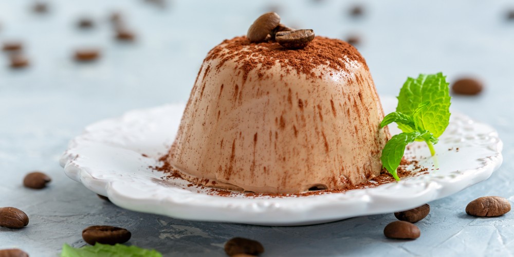 Ingredienti: 150ml caffè, 500ml panna, 100gr zucchero, 8 fogli di gelatina, 1 baccello di vaniglia, cacao amaro q.b., chicchi di caffè q.b., foglie di menta q.b.