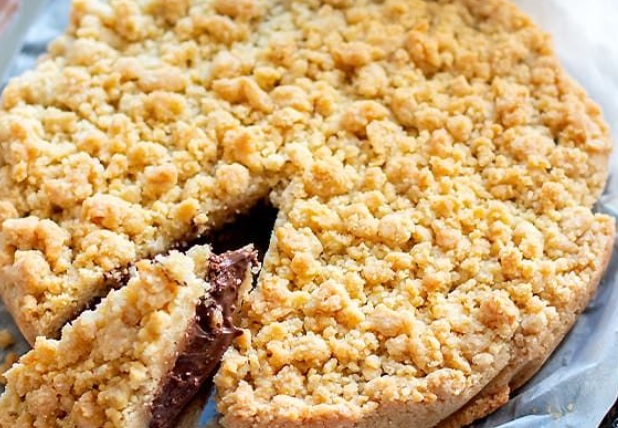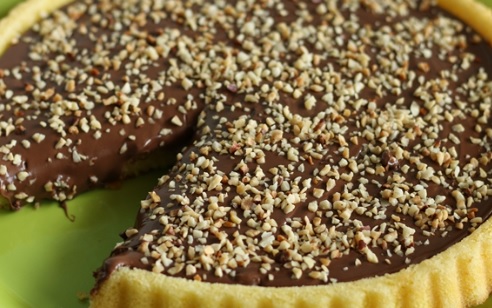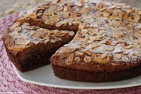Ingredienti: 3 tuorli, 130gr zucchero, 150gr burro temperatura ambiente, 30gr cacao amaro, 280gr farina 00, 1 pizzico di sale. Per la crema: 6 tuorli, 170gr zucchero, 500ml latte, 1 cucchiaino cannella, 50gr cacao amaro. Per decorare: mandorle tritate q.b. zucchero a velo q.b.