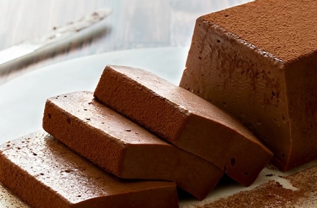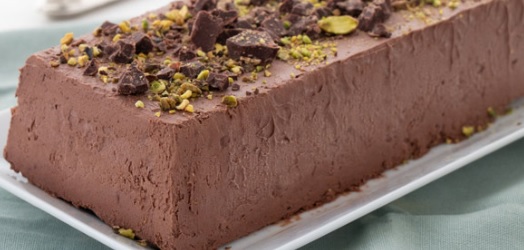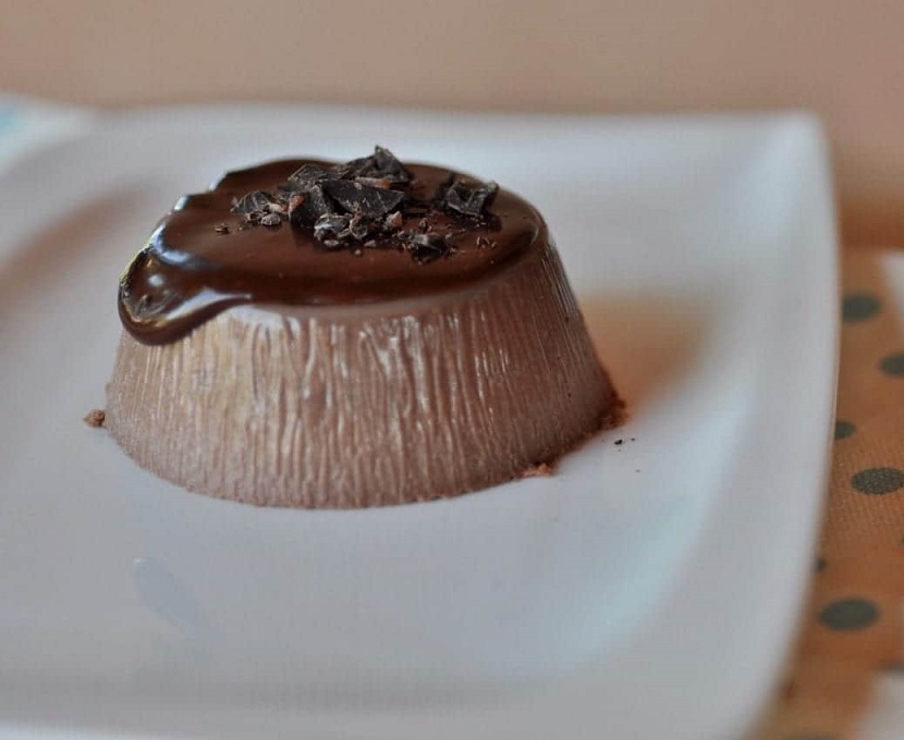 Ingredienti: 500ml panna, 50gr cacao amaro, 80gr zucchero a velo, 8gr gelatina fogli, topping al cioccolato q.b., scaglie di cioccolato fondente q.b.