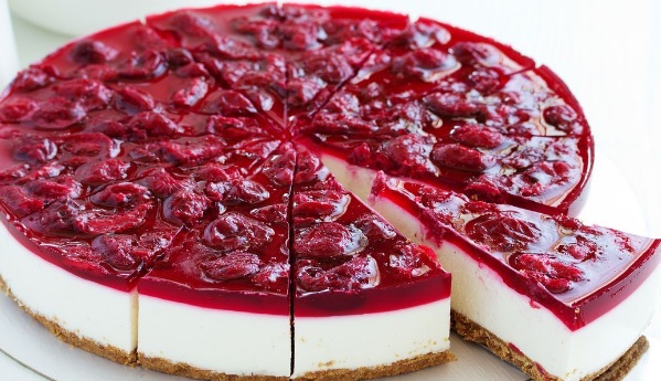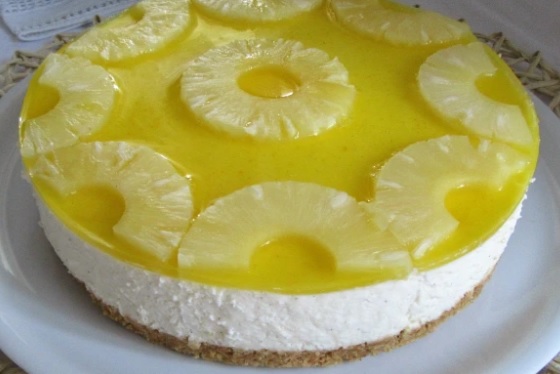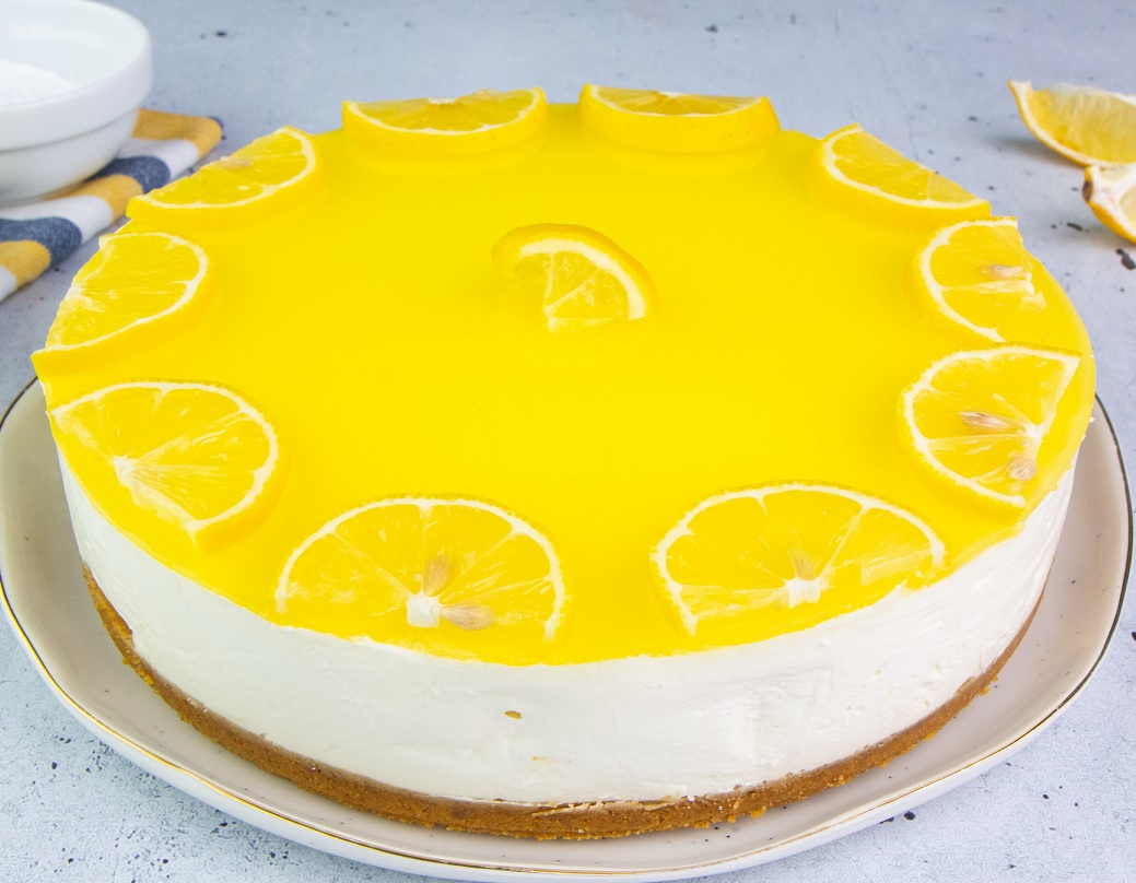 Ingredienti: 300gr biscotti tipo digestive, 150gr burro fuso. Per la crema 800gr formaggio spalmabile, 300ml panna, 60gr zucchero a velo, 8gr di colla di pesce, scorza di 1 limone, succo di 1 limone, succo di 1 arancio. Per la guarnizione al limone 140ml acqua, 90ml succo di limone, 80gr zucchero, 15gr amido di mais