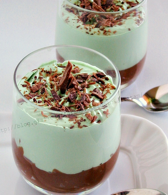 Ingredienti: Per la crema al cioccolato 250gr cioccolato fondente, 200gr panna, 100gr mascarpone, 1 bacca di vaniglia, 4 cucchiaini di sciroppo di menta. Per la crema alla menta 200gr panna, 100gr mascarpone, 4 cucchiai di sciroppo di menta, 15gr zucchero a velo