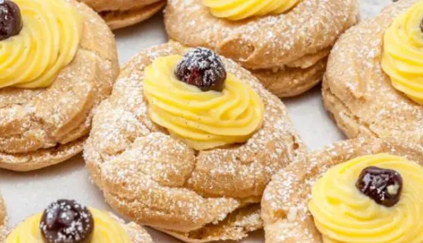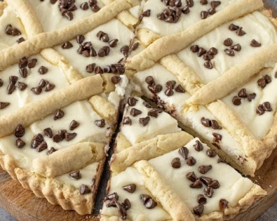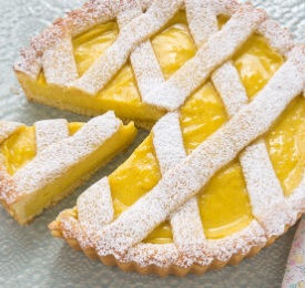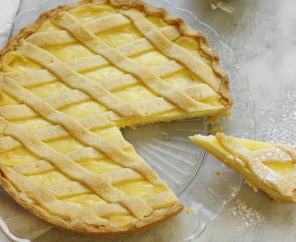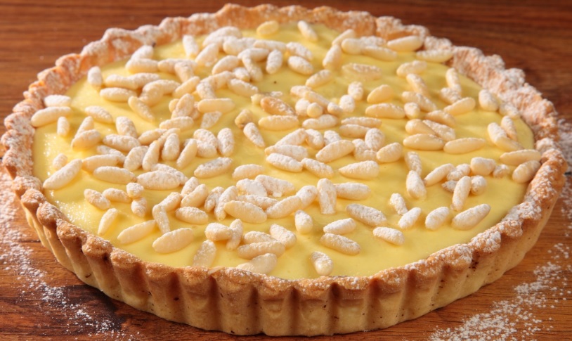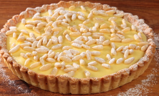 Ingredienti: 450gr farina 00, 200gr burro temperatura ambiente, 2 uova, 160gr zucchero, scorza di 1 limone. Per la crema: 500gr latte, 100gr zucchero, 50gr farina, 4 tuorli uovo, scorza di limone, 1 pizzico sale. Per la superficie: acqua q.b., pinoli q.b., zucchero a velo q.b.