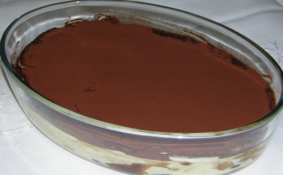 Preparare il caffè con la moka e far raffreddare. In un pentolino versare il latte, una scorza di limone, i semi di bacca di vaniglia e portare verso l' ebollizione. In un altro pentolino mettere i tuorli e lo zucchero e amalgamare con la frusta. Aggiungere l' amido di mais e continuare a mischiare il composto. Versare il latte caldo nel composto e riportare sul fuoco per addensare la crema. Dividere la crema in due terrine ed in una versare il cacao amaro e amalgamare. Versare l' alchermes in un piatto, allungare con acqua e un goccino di caffè, inzupparci i savoiardi e fare uno strato in una terrina rettangolare di vetro. Mettere la crema scura e fare uno strato. Immergere i savoiardi nell' alchermes con il caffè e fare altro strato in terrina. Mettere la crema chiara e livellare. Mettere in frigo per almeno 2 ore. Prima di servire spolverare con cacao amaro.