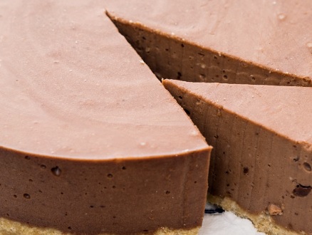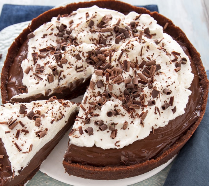 Ingredienti: Per la base 400gr biscotti al cacao, 150gr burro fuso, 1 cucchiaino di miele. Per la crema al cioccolato 120gr zucchero, 40gr amido di mais, 30gr cacao amaro, 1 pizzico di sale, 4 tuorli, 700ml latte intero, 130gr cioccolato fondente, 30gr burro a temperatura ambiente. Per la rifinitura 200ml panna da montare, 20gr zucchero, riccioli di cioccolato q.b.