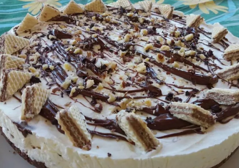 Ingredienti: 400gr wafer alla nocciola, 400gr panna, 200gr latte condensato, 200gr crema di nocciola, gocce di cioccolato q.b.
