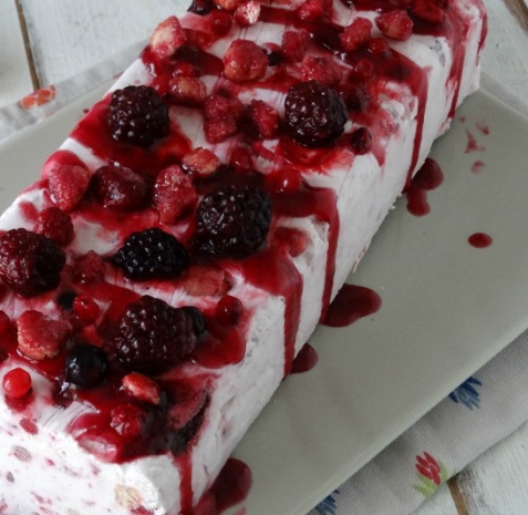 Ingredienti: 8gr di gelatina in fogli, 1 baccello di vaniglia, 80gr di zucchero a velo, 500gr di panna fresca liquida, 200gr di frutti di bosco ( anche surgelati )