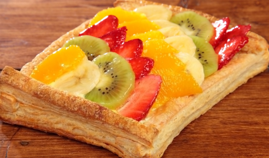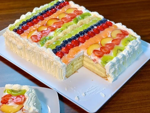Ingredienti: Per il pan di spagna Per il pan di spagna 5 uova, 175gr farina 00, 150gr zucchero semolato, 1 bacca di vaniglia, 1 bustina di lievito per dolci. Per la crema chantilly 1lt latte intero, 8 tuorli, 200gr zucchero semolato, 50gr farina 00, scorza di limone, 1 bacca di vaniglia, 250gr panna. Per la bagna 100ml acqua, 70gr zucchero. Per la decorazione 250 ml panna, 24 acini d' uva bianca, 24 acini d' uva nera, 24 ciliegie, 1 fettina di melone, 1 pesca senza pelo, 1 kiwi, 3 fragole, 1/2 banana, 2 fogli di gelatina