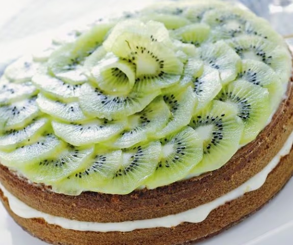 Ingredienti: Per il pan di spagna 5 uova, 175gr farina 00, 150gr zucchero semolato, 1 bacca di vaniglia. 350ml panna fresca, 150ml latte intero, 60gr amido di mais, 1 cucchiaio di miele, 1 bacca di vaniglia. Per la bagna 100ml acqua, 70gr zucchero. Per la decorazione 5 kiwi, zucchero a velo q.b.