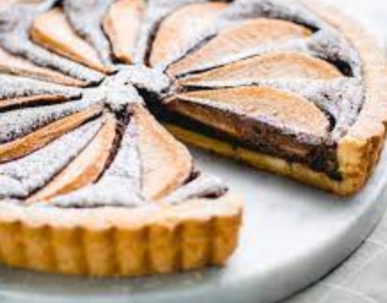 Ingredienti: Per la frolla 180gr farina 00, 100gr burro freddo, 1 uovo, 1 tuorlo d' uovo, 70gr zucchero, 1 pizzico di sale. Per il ripieno 200gr cioccolato fondente, 150gr panna fresca, 70gr zucchero, 1 uovo intero, 1 pizzico di sale. Per la guarnizione 2 pere, zucchero a velo q.b.