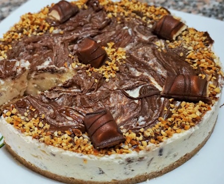 Ingredienti: Per la base 200gr biscotti digestive, 50gr granella di nocciole, 100gr burro fuso. Per la crema 250gr panna, 250gr mascarpone, 70gr zucchero, 100gr nutella, 5 fogli di gelatina, 1 vasetto piccolo yogurt bianco, 30gr granella di nocciole. Per la decorazione nutella q.b. granella di nocciole q.b., cioccolatini duplo