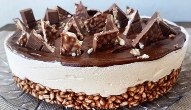 Ingredienti: Per la base 200gr cioccolato fondente, 150gr riso soffiato. Per la crema 250gr mascarpone, 250gr panna da montare, 100gr latte condensato. Per la finitura 100gr cioccolato fondente, 6 barrette kinder cereali, riso soffiato q.b.