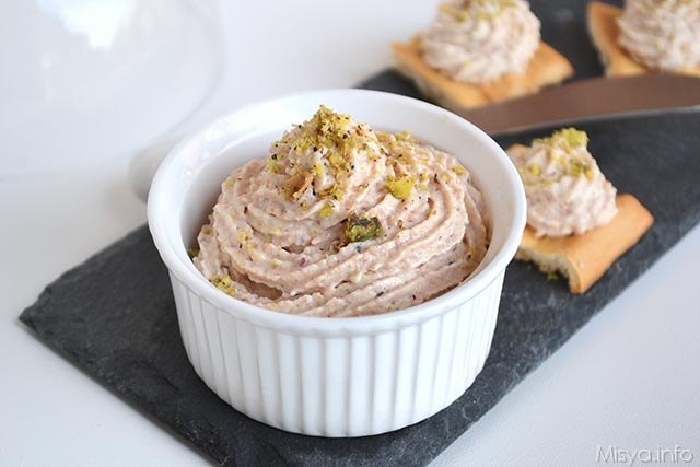 Tagliare a dadini la mortadella e metterla in un mixer insieme a stracchino, un pizzico di sale, pepe e noce moscata. Frullare tutto. Servire la mousse con granella di pistacchi sopra. Ottima su crostini.