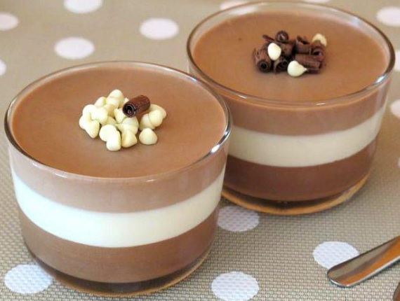 Mettere a bagno in acqua fredda i 3 fogli di gelatina. In un pentolino versare la panna e come sfiora l' ebollizione togliere la fuoco e versare il cioccolato ed amalgamare bene. Montare a neve la panna montata e come il composto di cioccolato si è raffreddato unirla ed amalgamare bene. Sciogliere 1 foglio di gelatina in un pentolino sul fuoco con 2 cucchiaini di acqua e versare nel composto ed amalgamare bene. Mettere il composto in un bicchiere creando uno strato e mettere in frigo per 30 minuti. Fare le stesse operazioni con il cioccolato bianco e con il cioccolato al latte. Tra un passaggio e l' altro mettere il bicchiere in frigo per 30 minuti. Guarnire con riccioli di cioccolato e mettere in frigo per almeno 3 ore.