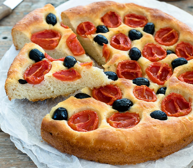 Ingredienti: 500gr farina 0, 350gr acqua a temperatura ambiente, 4gr lievito di birra secco o 6gr di lievito di birra fresco, olio evo, sale fino, 100gr pomodorini cigliegino, 20 olive nere, rosmarino