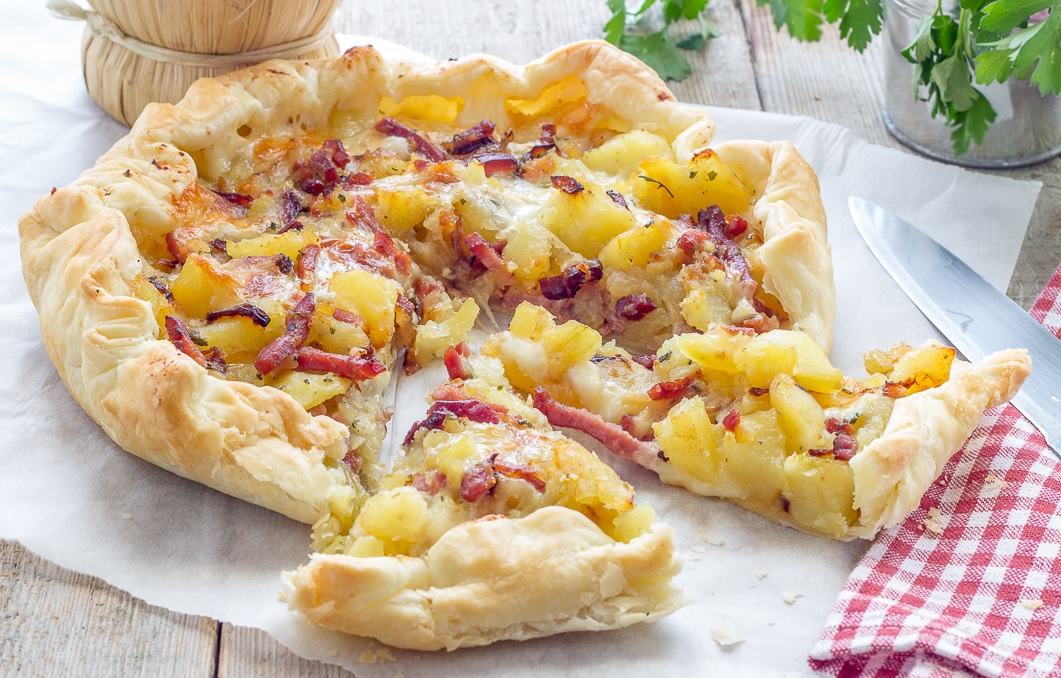 Ingredienti: 1 rotolo pasta sfoglia rotonda, 400gr patate, 180gr speck a bastoncini, 150gr scamorza affumicata a fette, sale, pepe, olio evo, 1 tuorlo, latte q.b.