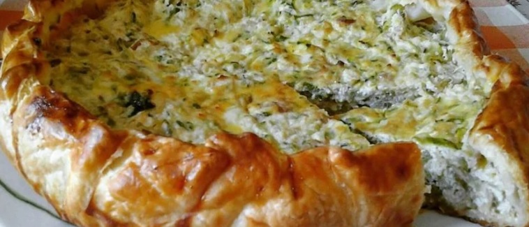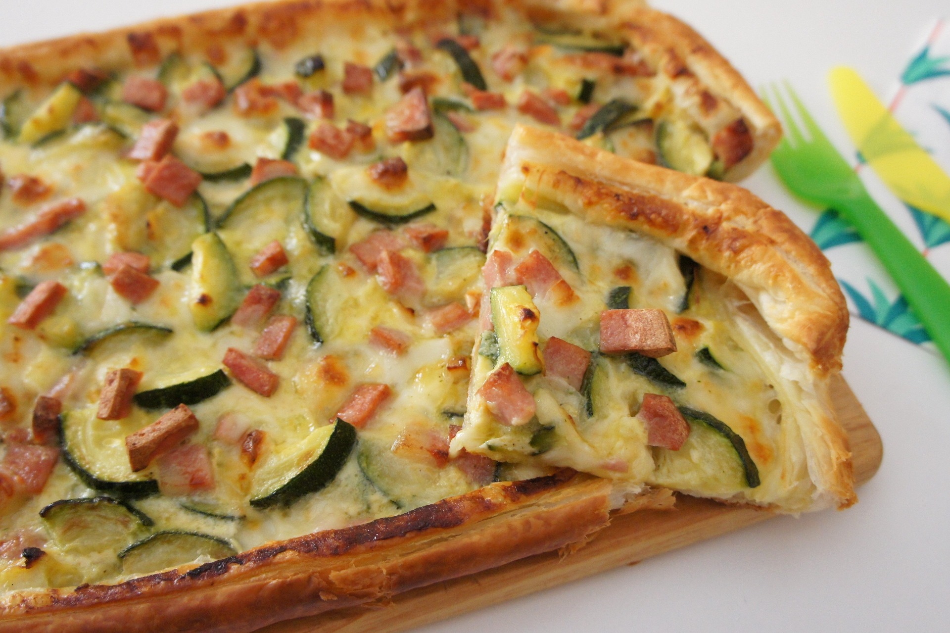 Ingredienti: 1 rotolo di pasta sfoglia rettangolare, 1 fetta spessa di mortadella, 2 zucchine, 6 fette di scamorza affumicata, olio evo, sale, pepe, 1 tuorlo, 1 cucchiaio di latte, 2 cucchiai di grana padano, erba cipollina polvere, 1 spicchio aglio