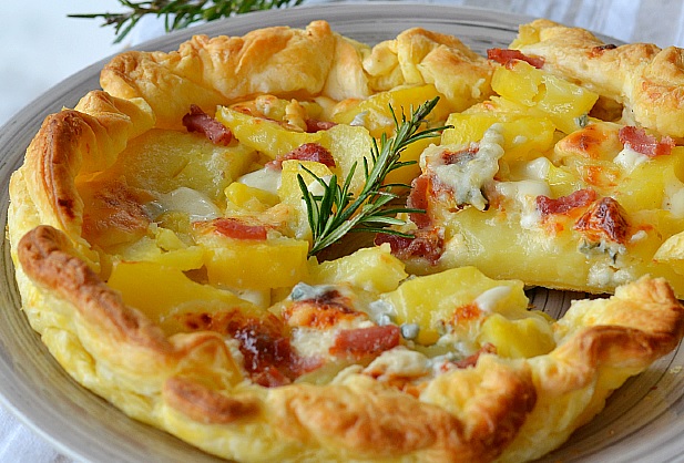 Ingredienti: 1 rotolo di pasta sfoglia, 300gr patate, 100gr gorgonzola dolce, 50gr speck a bastoncini, sale, rosmarino, 1 tuorlo, 2 cucchiai di latte