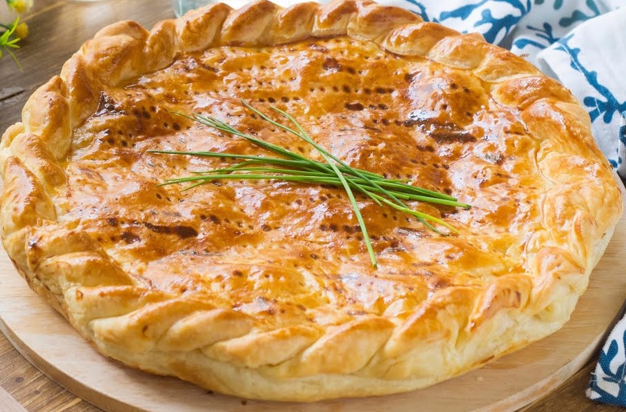 Ingredienti: 2 rotoli di pasta sfoglia rotonda, 2 patate, 150gr salmone affumicato, 200gr besciamella, 200gr mozzarella per pizza, pepe, erba cipollina, 30gr burro, 1 tuorlo, 1 cucchiaio di latte