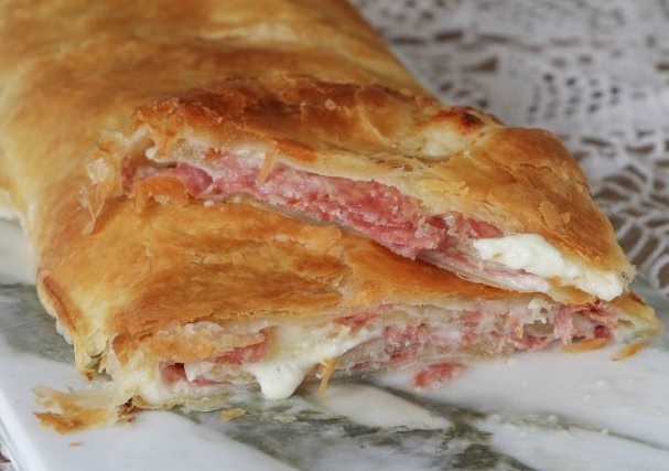 Ingredienti: 1 rotolo pasta sfoglia rettangolare, 200gr salame Milano, 150gr stracchino, 1 tuorlo, 1 cucchiaio di latte