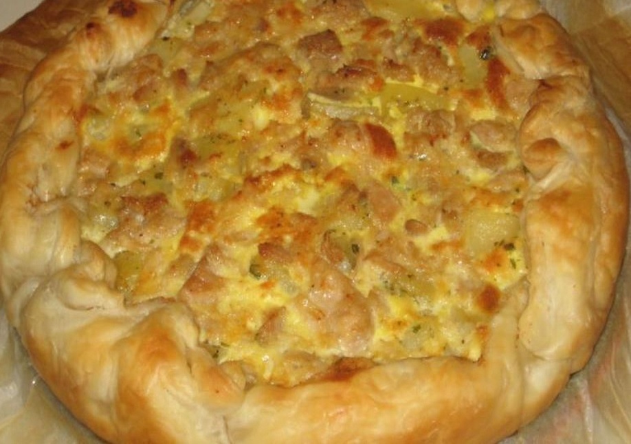 Ingredienti: 1 rotolo di pasta sfoglia rotonda, 500gr patate sbucciate e bollite, 250gr tonno sott' olio, 50gr burro, 150gr mozzarella per pizza, sale, pepe, 1 tuorlo, 1 cucchiaio di latte