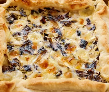 Ingredienti: 1 rotolo di pasta sfoglia rettangolare, 1 ceppo di radicchio rosso, 100gr Philadelphia, 1 mozzarella, sale, pepe, olio evo, 1 tuorlo, 1 cucchiaio di latte